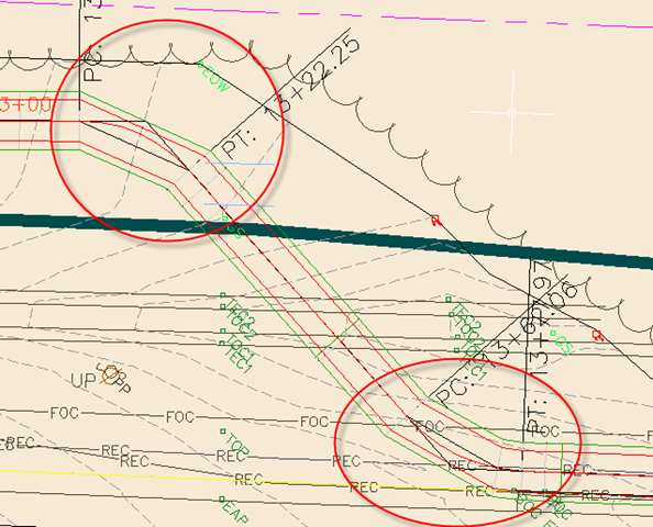 Many groups only use to Corridor for it’s model and surface functionality, leaving any other visual references to ‘pretty’ 2D drafted geometry. In the event that you choose to maximize the Corridor for more of it’s material and Feature Line visualizations, you will need to increase the the curve and spiral frequencies dramatically, possibly sub 1’, depending on viewed scale.