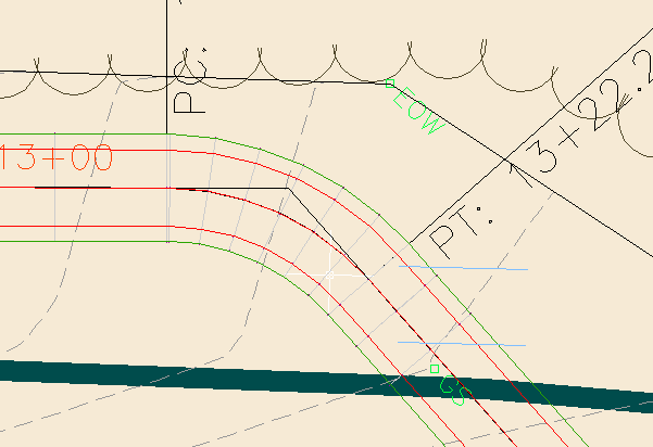 In the example above, the curved portions of the Corridor are segmented at 25’ intervals. As is true in many fine detailed situations, a 25’ interval is too sparse to accurately grade the region.  So we should change this region’s interval frequency in the Corridor properties to something more useful.