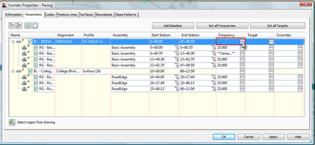 After retuning to the Corridor Properties, I added a region after the last in the sidewalk baseline. Upon opening the frequency dialog for that new region we see is set to 5’.