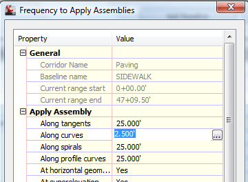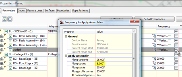 We change the 25’ to 2.5’ in the ‘Along Curves’ field.  After it updates the region, the display changes to “Varies”.  (Tangent, Spirals, and Profile curves are still set to 25’). If we go back to the Corridor model, we’ll see the curve updated with Assemblies at every 2.5 ‘.