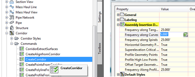 Here most of the default settings that pertain to creating a new Corridor are catalogued.  Under the Assembly Insertion Defaults you will find our Assembly Frequency Intervals.  I adjusted mine to 5’, so we can see the difference after we return to the Corridor Properties (the last change we made was 2.5’).
