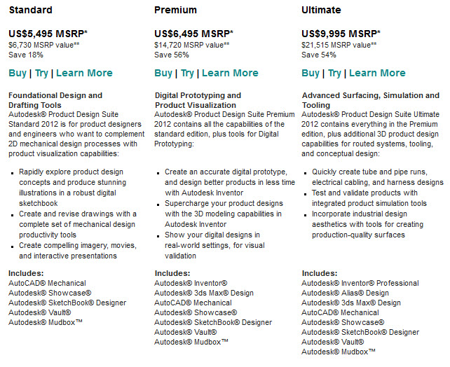 Manufacturing has published their pricing, which you can find below. Additionally, if you are a Manufacturing subscription customer, then you get a huge gift. If, for example you use Autodesk Inventor Professional, you will receive Autodesk Design Suite Ultimate at no additional charge. Why? When asked Buzz Kross, Manufacturing Division Vice-President responded “Competitive Separation”. Autodesk wants to distribute the capabilities and opportunities of the suite to it’s customers, making both the customers and themselves more competitive and ultimately more profitable it their respective markets.