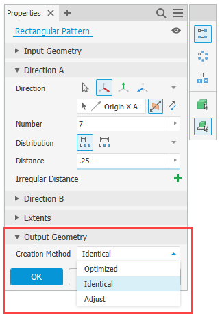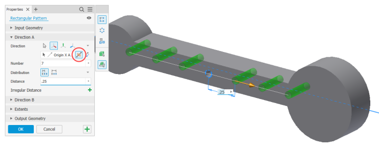Rectangular patterns arrange the selected features into rows and columns. You set the Direction and Number. The direction sets the directions of the rows and columns. The number is how many occurrences (including the original) to copy in the direction. The number must be greater than zero.