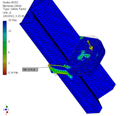 The Invar mount bracket in Inventor Stress Analysis. This simulation looks at the effects of a 200 poind man standing on the bracket.