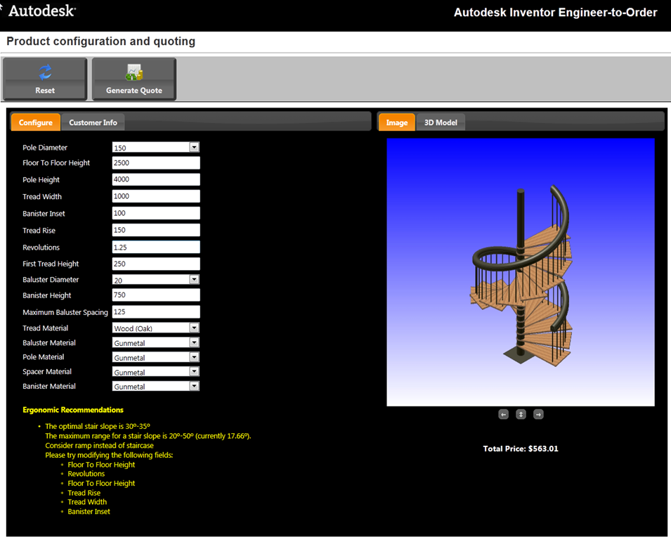I changed the axial rotation to something problematic, and the system responded by configuring the model, and warning me that there were constraints that needed to be addressed (like you’d have to climb the stairs on your hands and knees). The price is updated, and you can instantly pick generate quote to proceed.