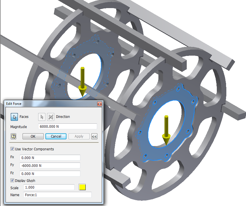 In my case, I wanted to see what the effects of the total load would be upon each face. What I did was apply separate loads to each, using the same load of 6000 N. See the difference in displacement.