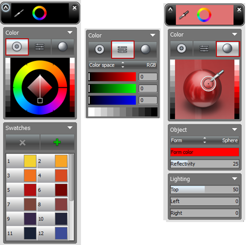 The Color Editor controls the colors of the entire document.  This interface provides comprehensive control and easy navigation to access the lighting and color adjustments. Wheel, Sliders, and Reference color adjustments are set on alternate tabs. The sliders can be changed out from RGB to CMYK, HSI, and HSB.  The reference color interface permits a preview of a lit and shaded object that in turn can be picked from for fine tuning of shading fills.  A nice touch.