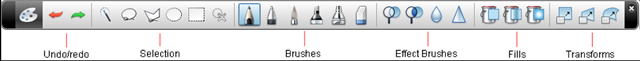 • Brushes: Pencil, Pen, Brush, Marker, and Airbrush (eraser is Paint only)