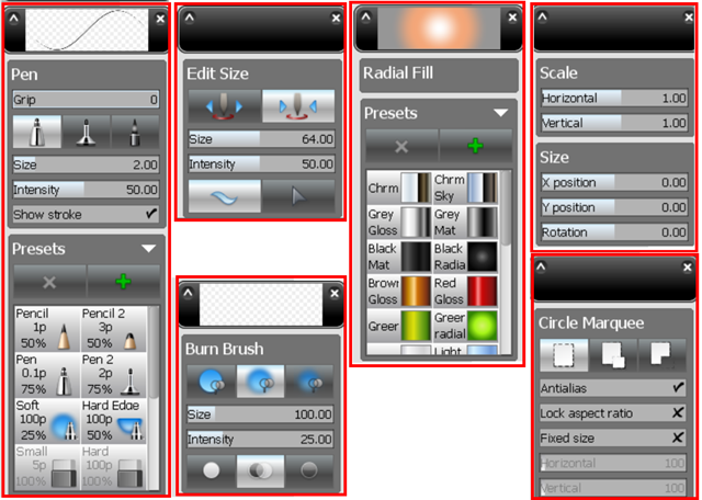 • Effect and blend brushes: Dodge, Burn, Blur, and Sharpen