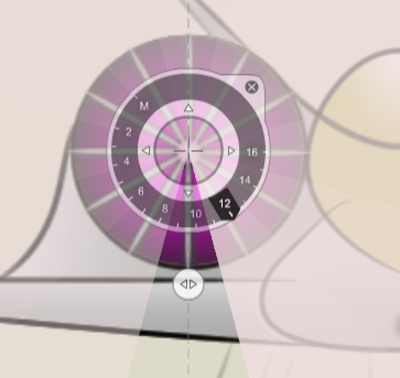 Whenever the symmetry property of any layer or folder is set on, a manipulator is displayed while that layer is active. The axis of the symmetry is displayed, and controlled by dragging the control where the line of symmetry is desired. The axis can be rotated by a drag glyph present on the axis.