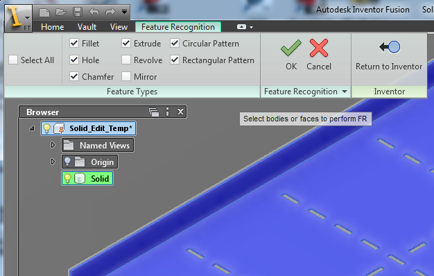 Once selected, a control panel is displayed that allows the user to search a component for fillets, holes, chamfers, extrudes, revolves, mirrors, and patterns. Just select the component, and pick OK. The tool then searches the part geometry for key signatures that fulfill these filters. Once detected, the features are populated into the browser. At this point the features can be selected in groups through the Browser.