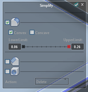 Once the features are located and accounted in the Fusion Browser, the Simplify tool can be used to review these and remove them with the push of a button. Sliders for each feature type can be manipulated from the smallest to largest feature size in order to limit the feature set included in the removal. Each feature that remains in the Simplify selection is graphically highlighted on the model, making the decision process a snap.