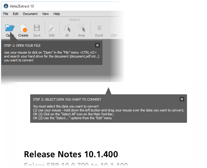 The one thing that hasn’t changed is the user interface, and this is a good thing. The UI is clean, modern, and simple to understand. The ribbon is laid out in the order of operation… open the PDF, select the objects to convert, set the output type, and you create your document. Pop-up bubbles aid in selecting the right step, great for first-time users. These bubbles are easy to dismiss and simple to disable once you become more comfortable with the software. As a regular Adobe product user, I really miss the shortcuts for pan / scroll (Middle Mouse Button) and zoom (Ctrl + wheel ). In Able2Extract you have to use the toolbars, which is a pain.