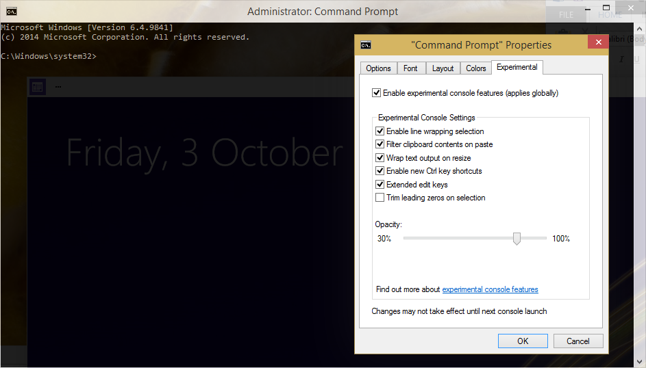 Autodesk power users will be very familiar with Windows Command Prompt, they will also know how dated it is. Surprisingly, even in the presence of the much vaunted Windows PowerShell, the lowly old Command Prompt has received some attention. I didn’t even realize this until today, but you can access the Command Prompt Properties dialog from the Title bar context menu. In there Windows 10 has an Experimental tab containing a host of new goodies. As you can see in the image above, we can now control the opacity of the window, which is rather swanky. But the big win is the ability to highlight text like a normal person and when you hit Ctrl + V on your keyboard, you aren’t greeted with ^V. THANK YOU Microsoft!