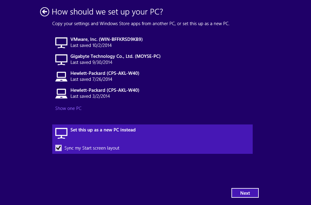 To get started I swung over to the Microsoft Insider Program website and signed up. Super easy, especially since my browser was already logged into my account. After accepting the agreement, I had my pick of which installer language I needed. 4GB later, about half an hour, the ISO file was ready to be mounted to a VMware instance. Once that was configured, the install process was no different to the Windows 8 process. I had the choice of upgrading or installing a fresh copy. Since it was a VM, I went with a fresh copy. I have my VM’s running on my local Samsung EVO SSD drive, so the installation was done in just under 10 minutes. From booting the ISO image to logging into Windows within 10 minutes!!! It wasn’t that long ago with Windows 7 where you would easily be waiting nearly an hour to get the operating system installed. Once I gave the install my Microsoft credentials, it asked me which PC I wanted to copy my settings from, or if I wanted to create an independent computer. That isn’t something I’ve seen with Windows 8, and to be honest, it’s a welcome addition. I wonder if there is a setting somewhere to retrospectively ‘detach’ the PC from your group of sync’d devices.